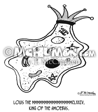Biology Cartoon 5015: A large cell driving a car with a bumper sticker, "Amoebas don't do it."