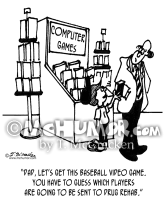Drug Cartoon 3368: A kid buying a game saying, "Dad, let's get this baseball video game. You have to guess which players are going to be sent to drug rehab."