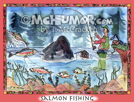 Salmon Cartoon 8012H: "Salmon Fishing." While a man fishes with a rod and reel a fish tries to tempt him with beer on a line.